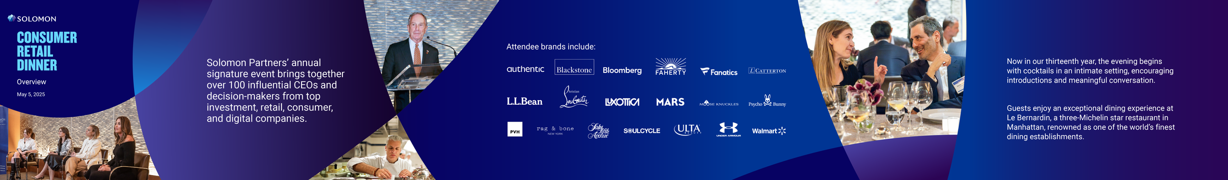 Solomon frequently hosts or participates in conferences and exclusive dinners for its clients and contacts. Invitees include executives from retail, consumer, media and tech companies, as well as members of the press and thought leaders. Event branding includes digital signage, slides, menus, digital and print agendas, door and event decals.
